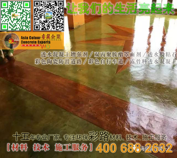 优势:根据表面的类型使用不同的施工工艺。可在抛光混凝土地坪,薄覆盖层,自流平覆盖层,压模地坪或普通混凝土地面上使用装饰性着色剂和染色剂。这是一个长期持久,不剥离,开裂或褪色的处理方法。它会像地坪本身一样耐久。外观很丰富,像大理石或破旧的皮革通常的着色剂是棕色和绿色的自然的泥土色调。而染色剂可创造鲜艳的色彩。着色混凝土地坪很容易清洁,与地毯,硬木或瓷砖不同,它们不会吸纳灰尘和污垢。